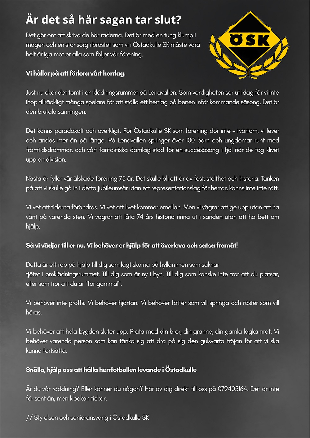 Det gör ont att skriva de här raderna. Det är med en tung klump i magen och en stor sorg i bröstet som vi i Östadkulle SK måste vara